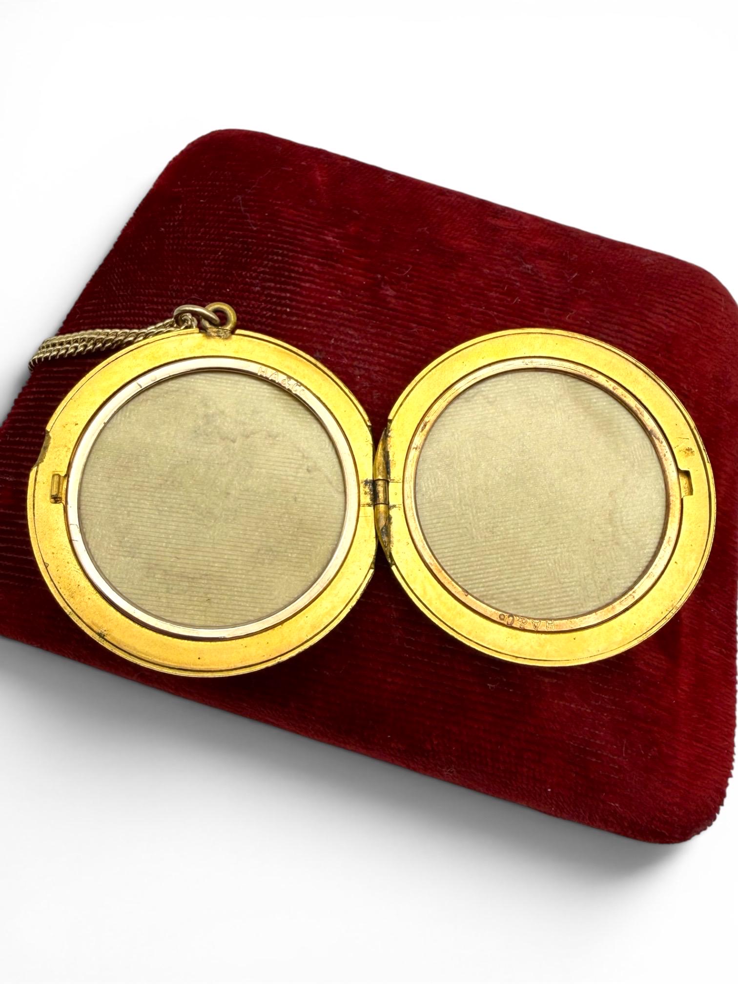 Inside the locket are two compartments for round photos with the frames, paper backings and plastic covers intact.