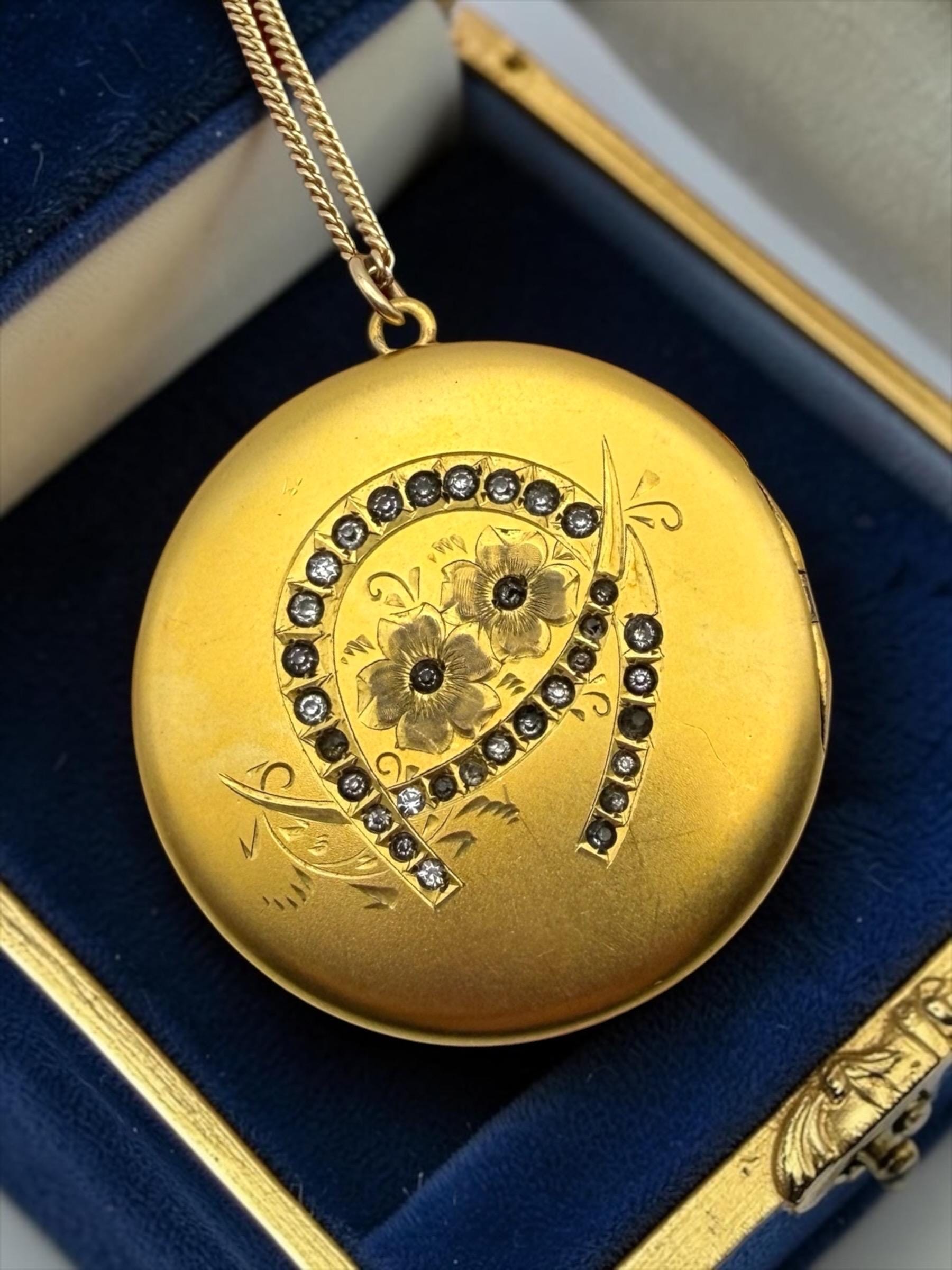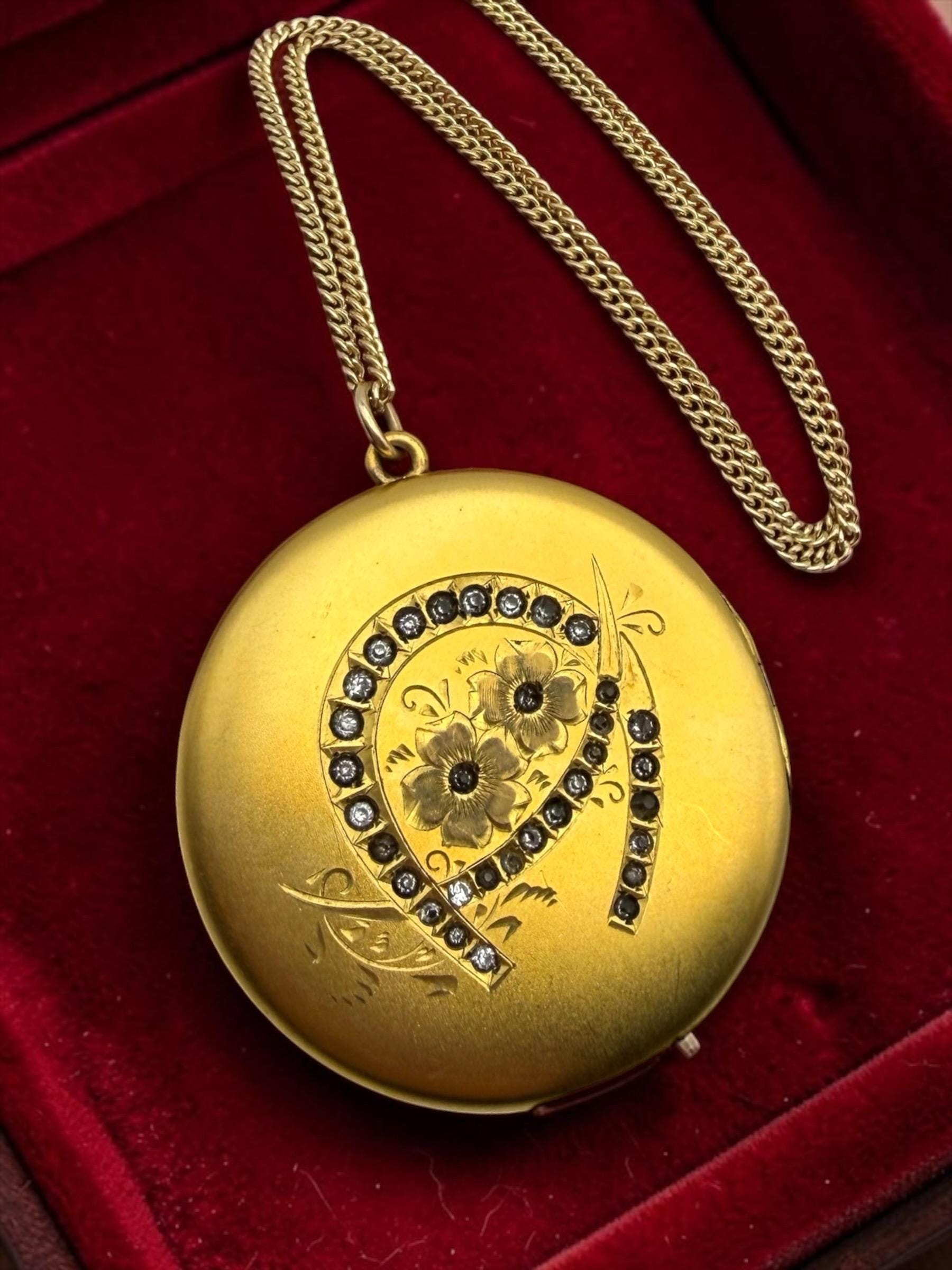 In nice antique condition with light wear as would be expected an antique item that is circa 1900s-1910s - see photos for detail. Some light use marks here or there but overall very nice vintage condition. Chain is new and in great condition. Amazingly LARGE vintage locket!