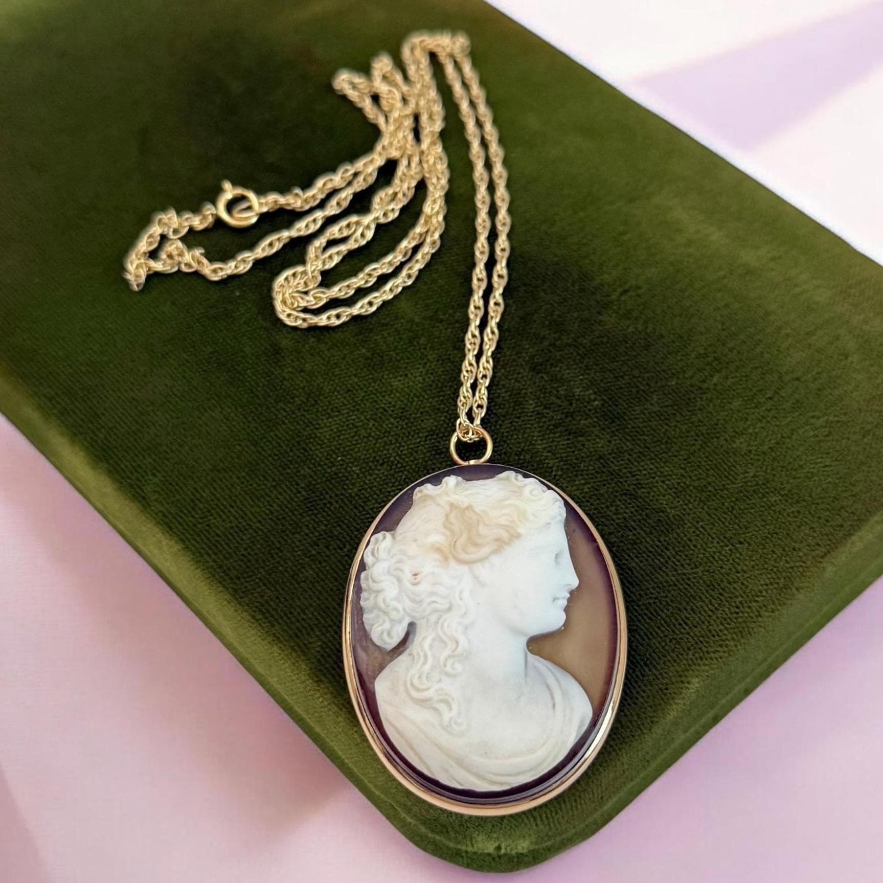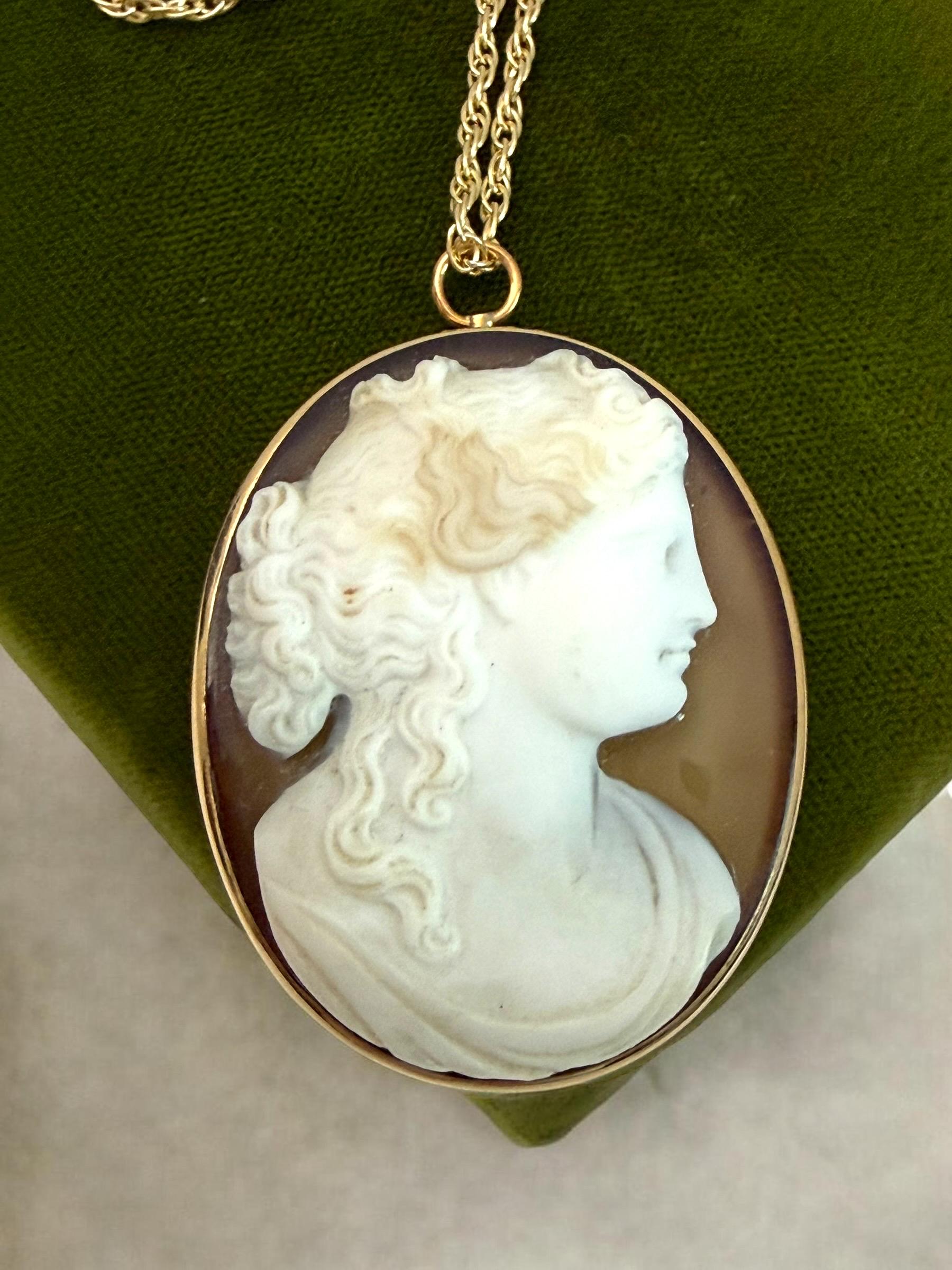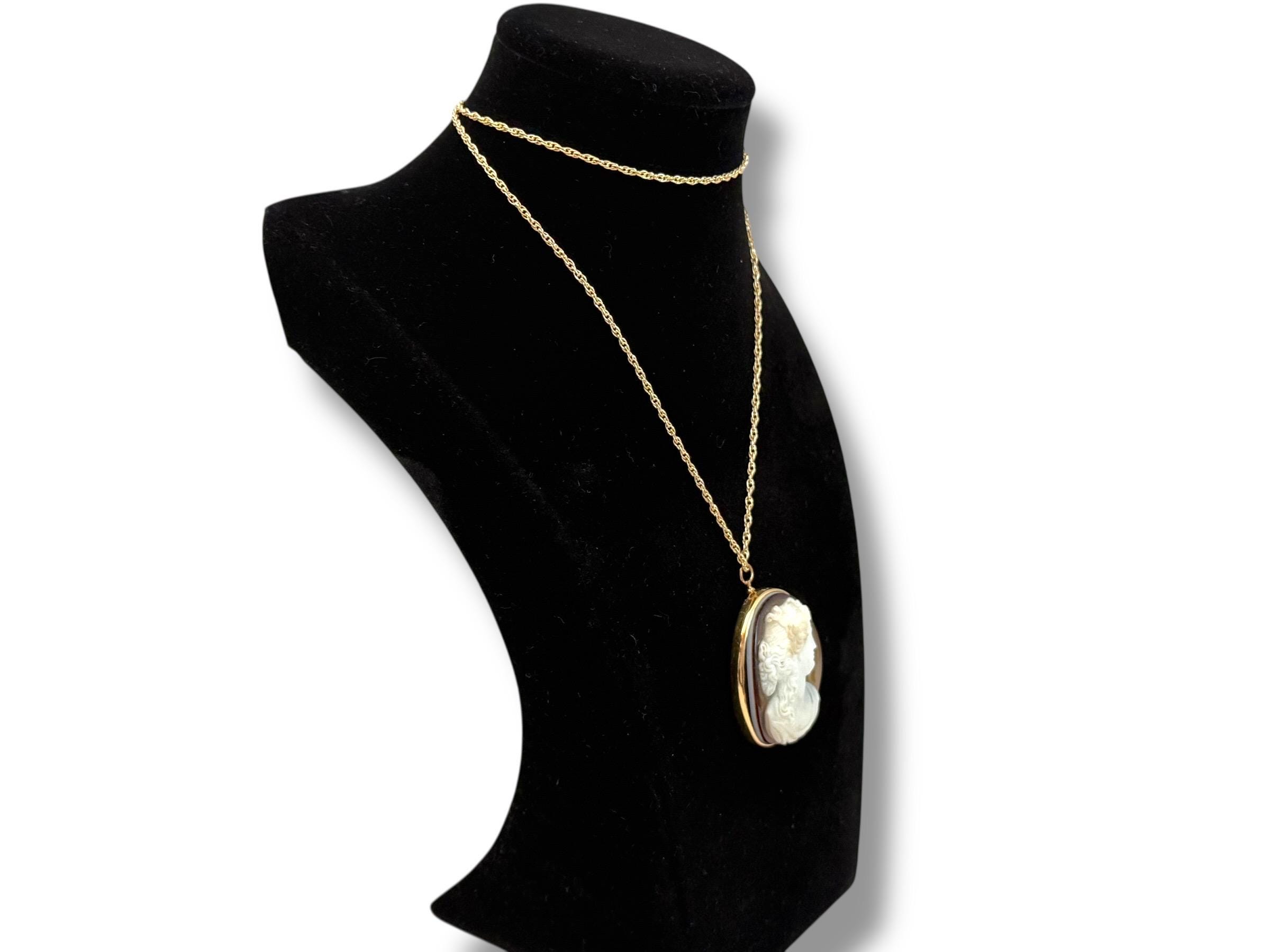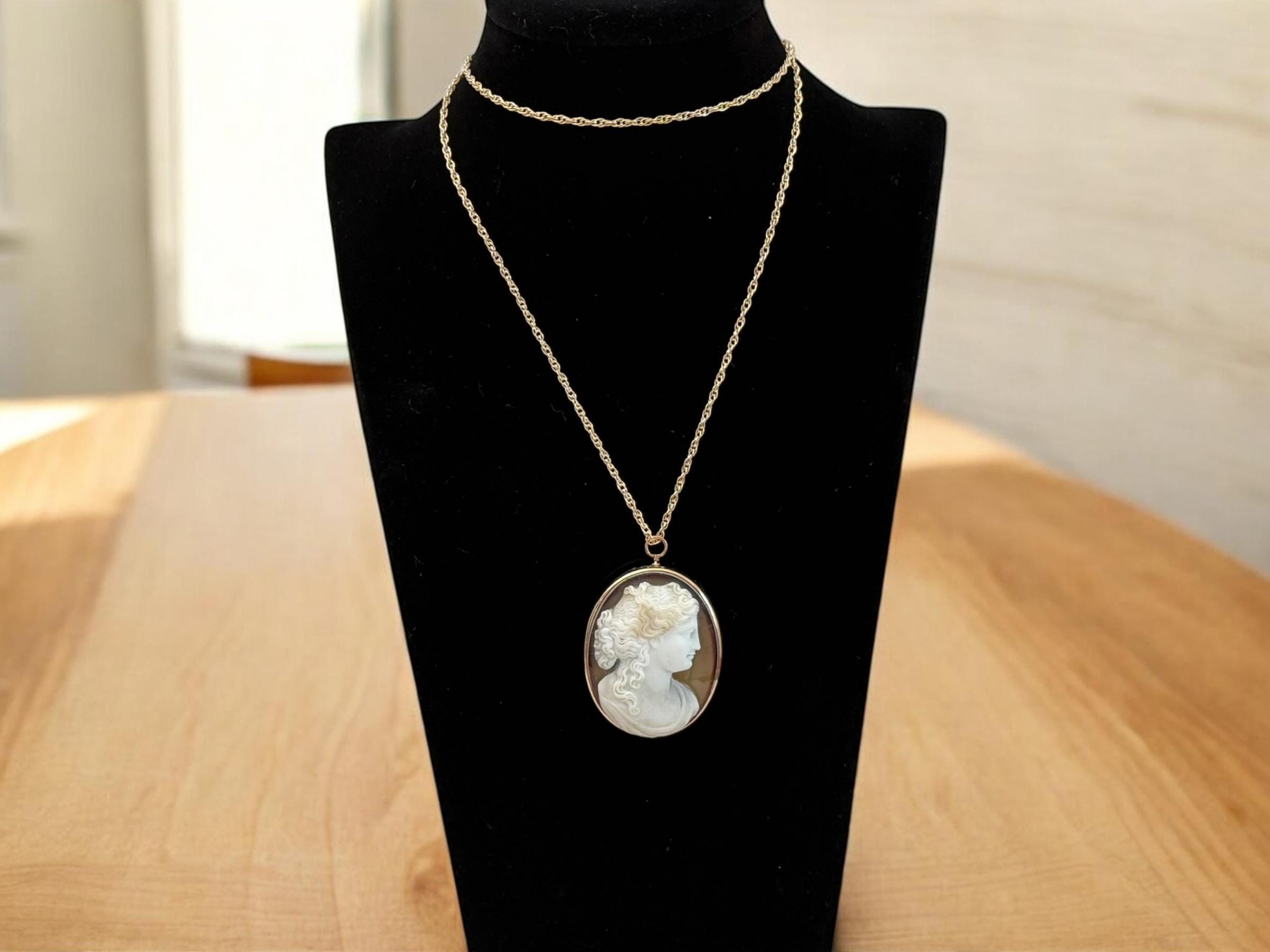 Victorian 14K Gold Cameo Pendant Necklace: Large Carved Stone on Long Gold Filled Chain