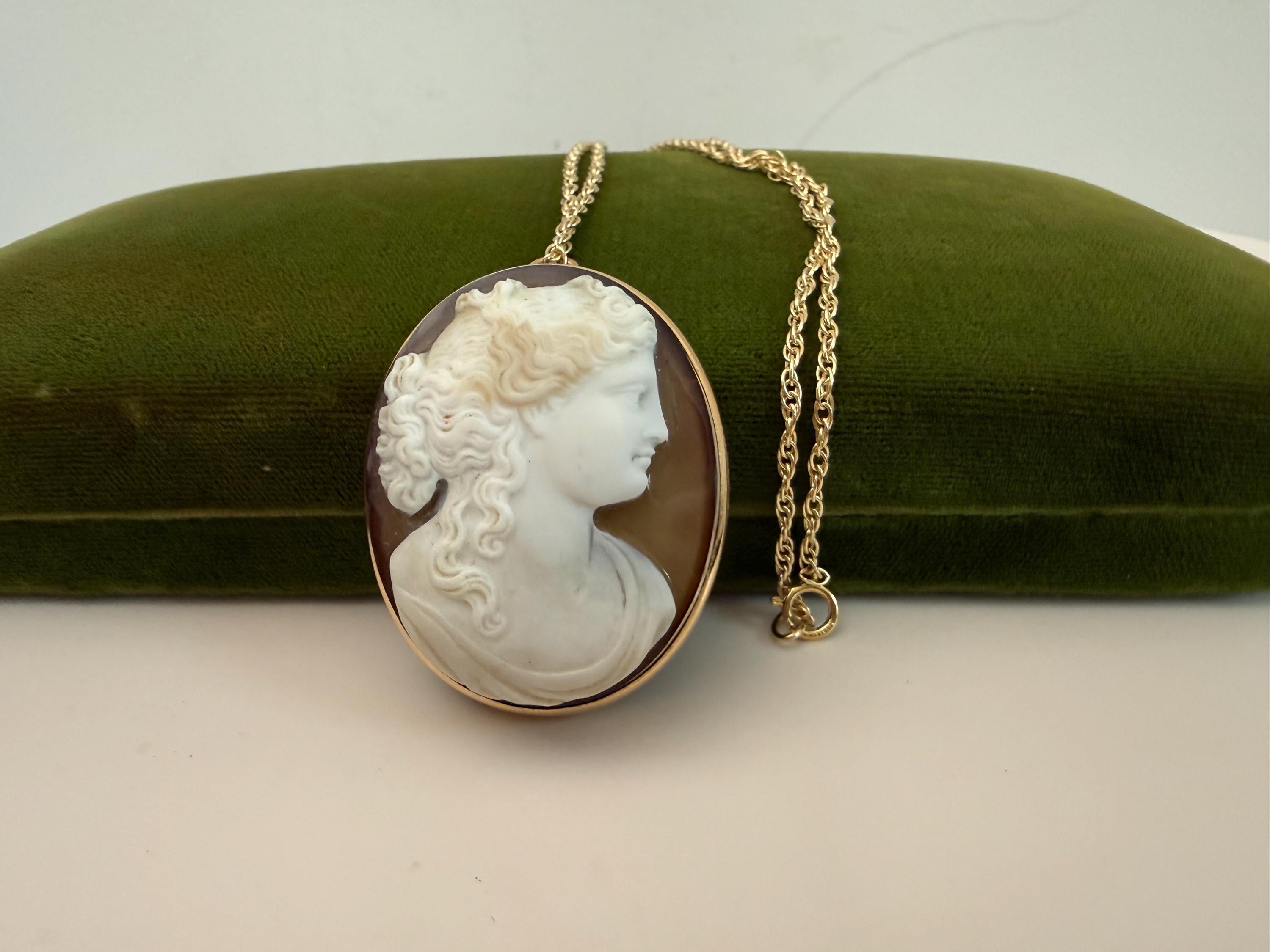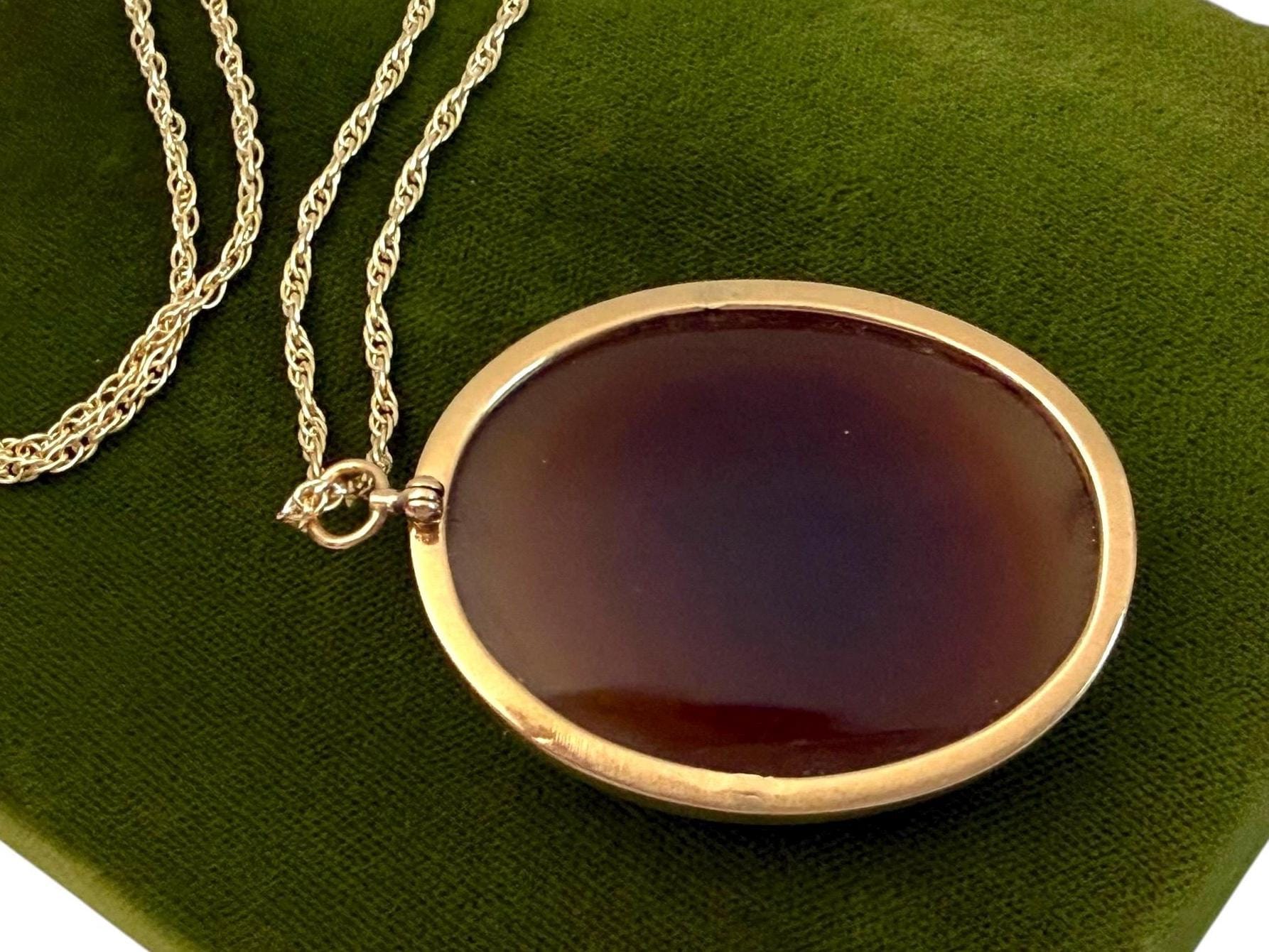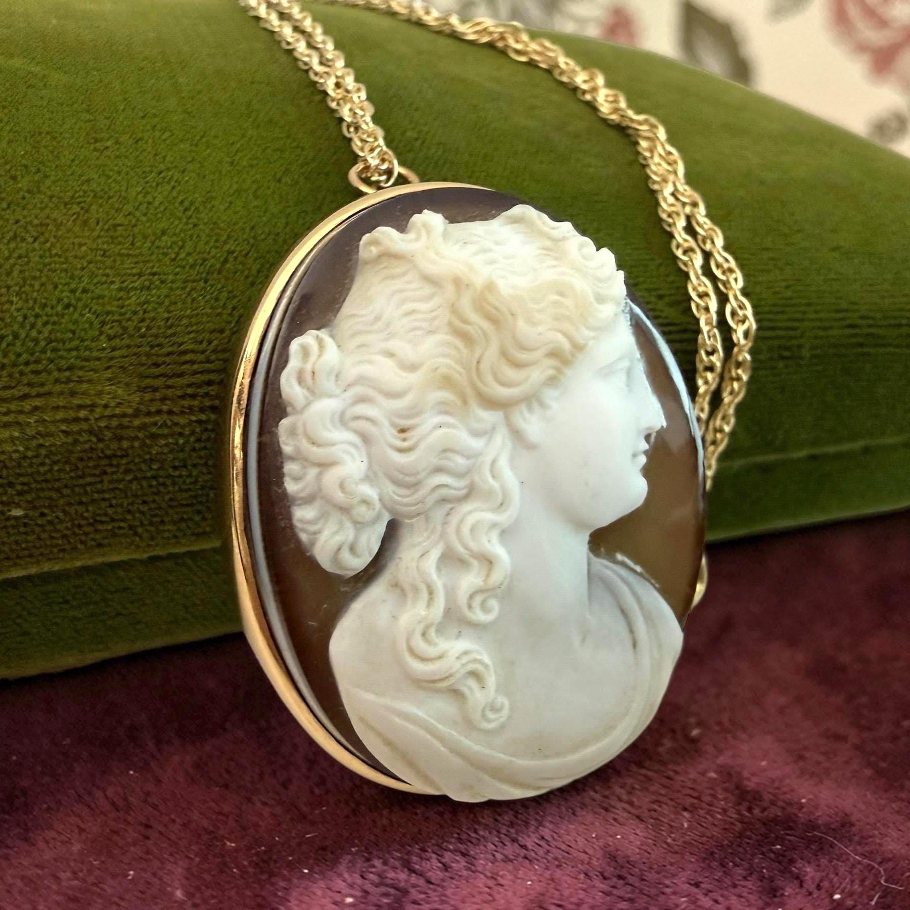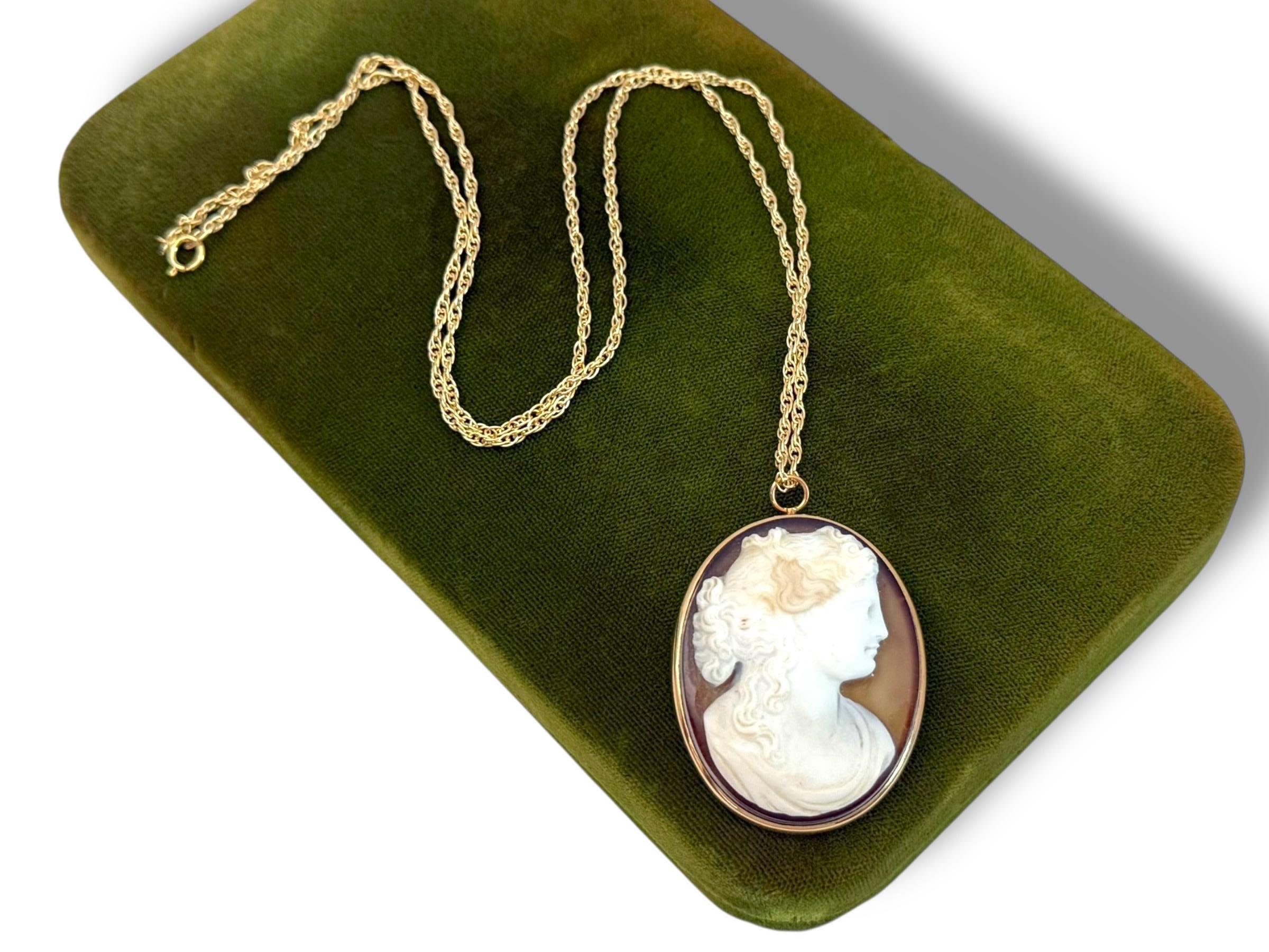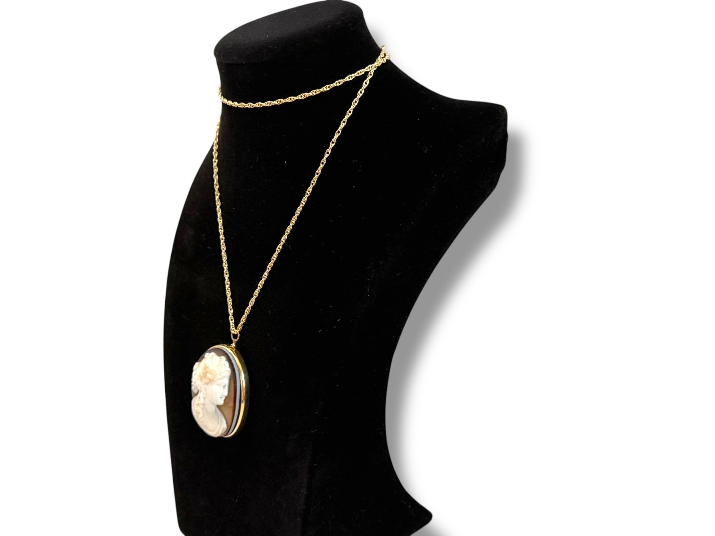 Victorian 14K Gold Cameo Pendant Necklace: Large Carved Stone on Long Gold Filled Chain
