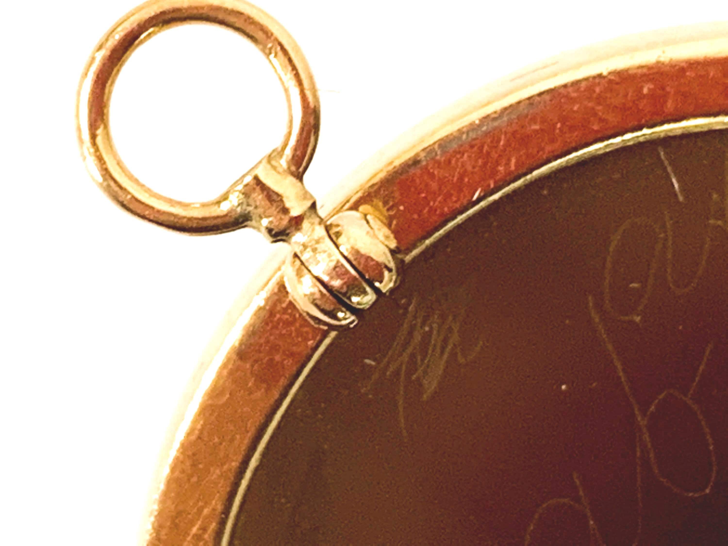 Victorian 14K yellow gold carved stone oval cameo pendant that is a large size. The carved image of a woman’s profile is in an oval shape. This antique pendant has a substantial gold frame all around the cameo. The top loop bale has a hinge that allows the loop to be tucked under or to be extended upward. The pendant is pictured on a 14K gold filled rope chain that is 24” long. The pendant can be purchased with or without the chain.