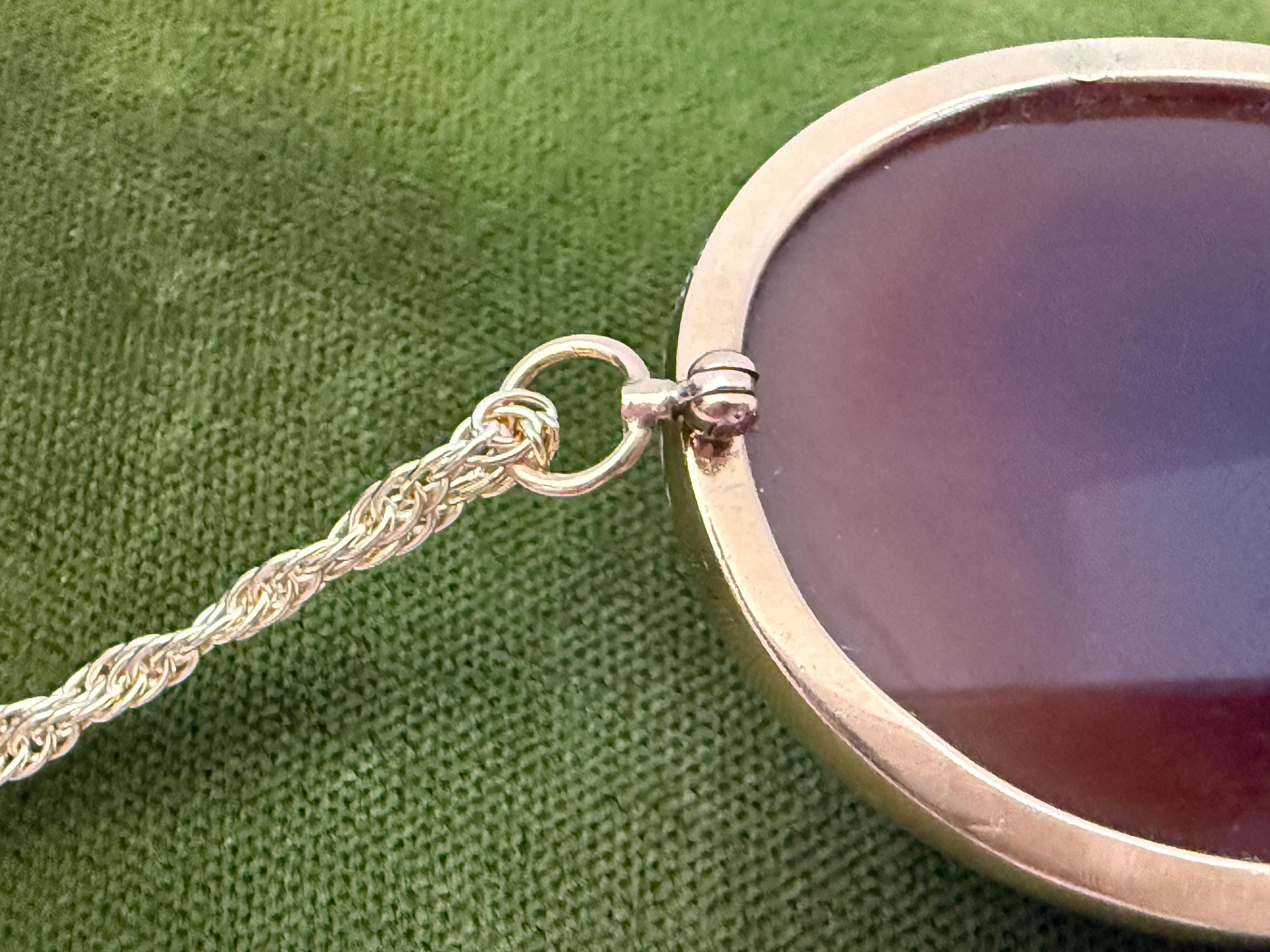 The carved cameo pendant measures approximately 1 1/2” x 1 1/4”. The 14K gold filled rope chain is 24” long.