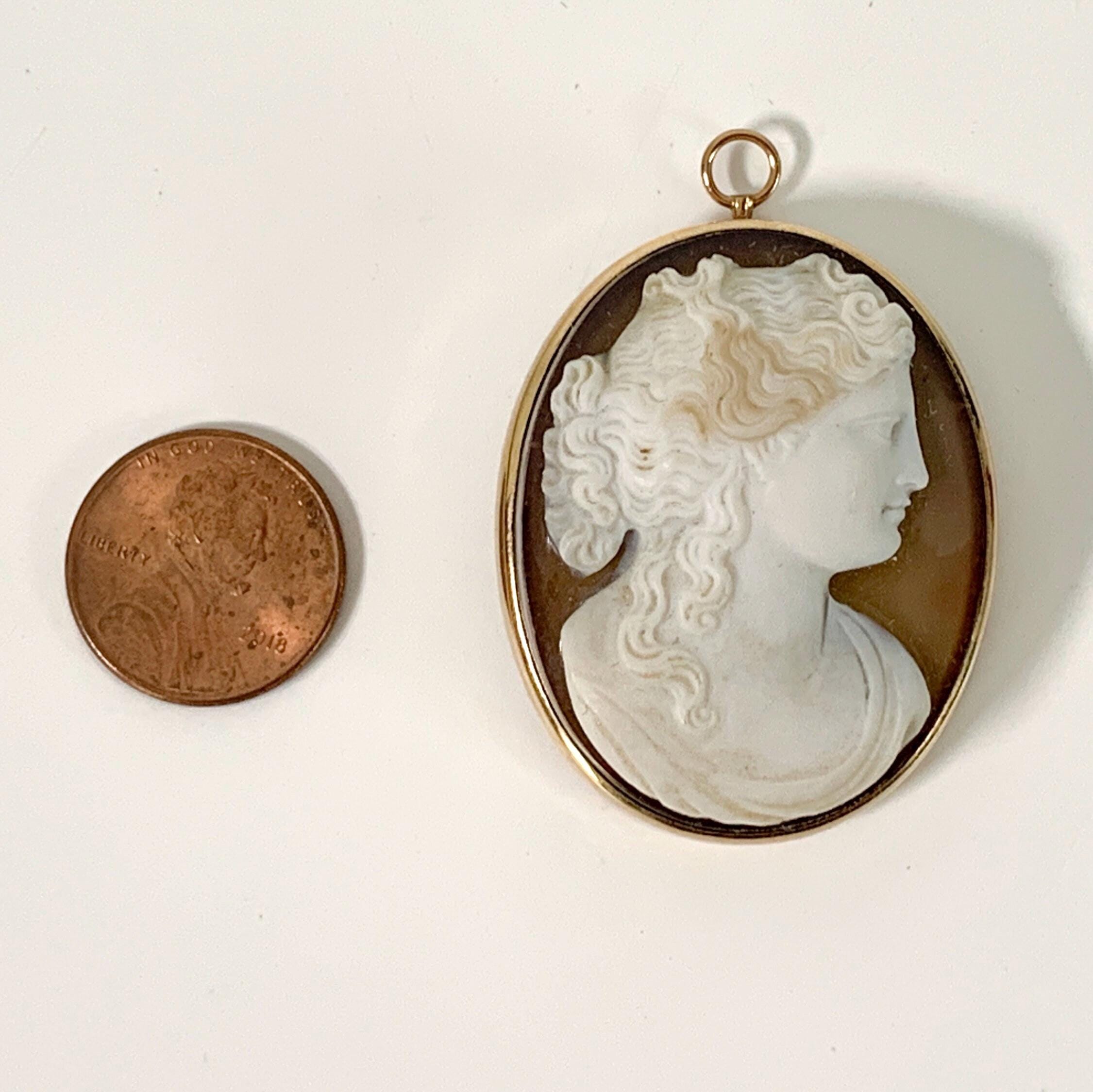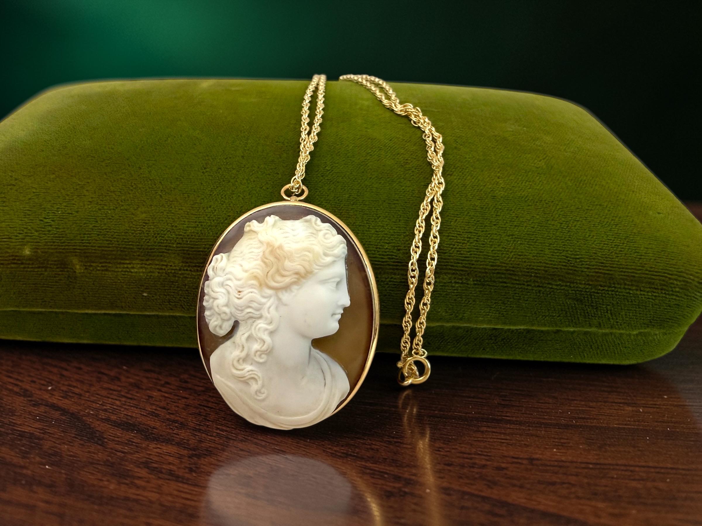 A classic Victorian 14K gold carved stone cameo pendant of impressive size! It can be purchased with or without the 14K gold filled rope chain - the options are available at checkout.