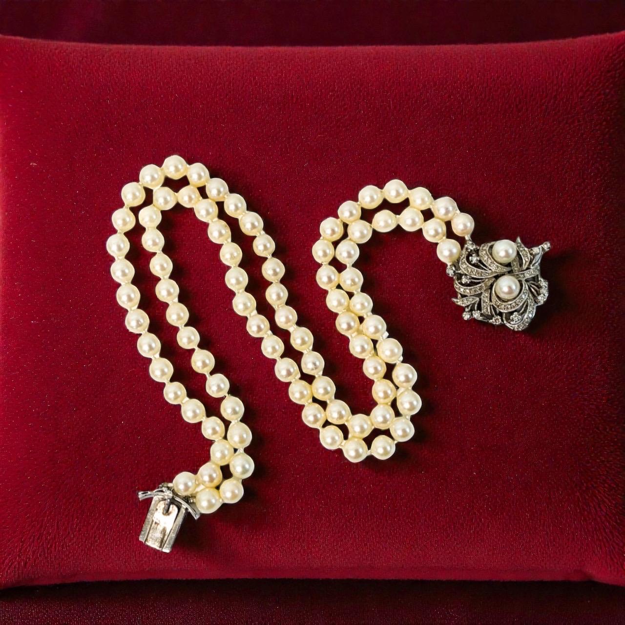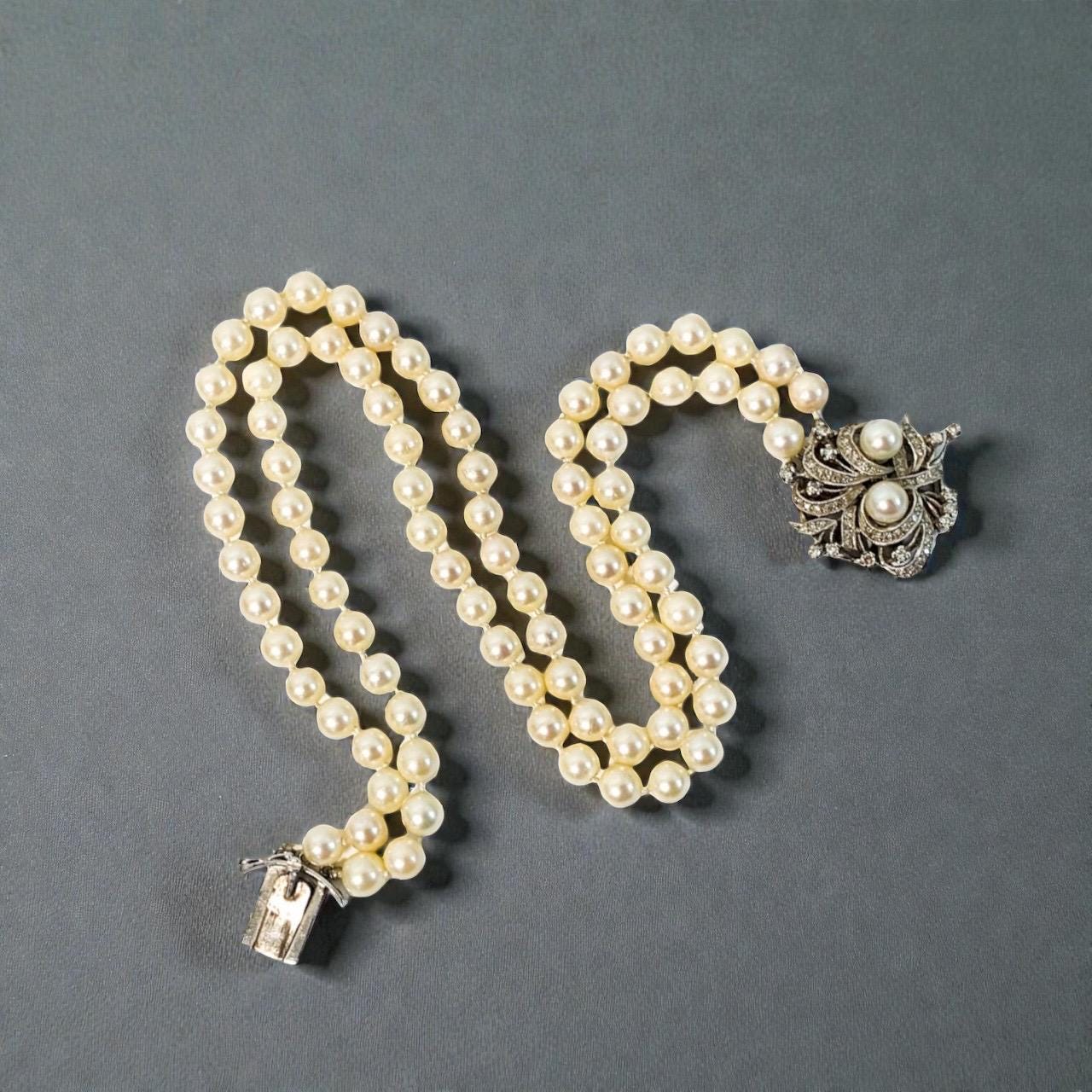 Vintage Pearl Choker: 14K White Gold Floral Diamond Clasp, Double Strand